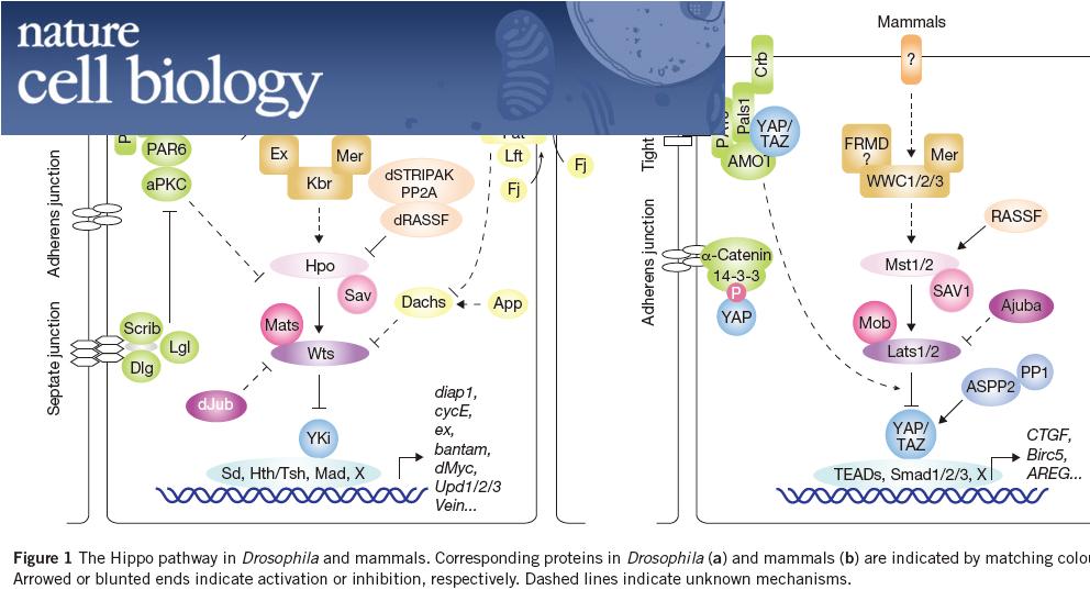 器官和机体的大小是多细胞生物最基本的特征之一。例如大象的体形总是要比小鼠大得多,又例如哺乳动物的肝脏部分切除后能精确再生到原来的大小。然而,这些有趣的生物学现象却长期未能得到分子水平的解释。最新的研究表明一条在进化上高度保守的叫做Hippo通路的新的细胞信号传导途径对器官大小的调控起着至关重要的作用。例如敲除该通路中的激酶基因Mst1/2导致小鼠肝脏过度生长至正常大小的四倍。Hippo通路的蛋白激酶能够导致YAP和TAZ转录辅激活因子的磷酸化和失活进而抑制细胞增殖,促进细胞凋亡。进一步的研究显示这条信号通路还调控干细胞自我更新及组织再生,特别是与癌症的发生密切相关。因而该通路的研究不但是发育生物学的重要课题,而且对人类疾病的治疗具有指导意义。最新的证据还表明Hippo通路受细胞极性,细胞粘附和细胞连接蛋白的调控。本文总结了当今关于Hippo通路组成和调控的理解,并讨论了Hippo通路可能如何整合细胞极性和细胞连接的信号来调控器官大小和组织再生。
