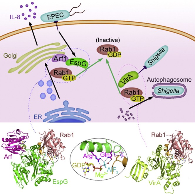 通过三型分泌系统分泌毒力效应蛋白分子进入真核宿主体内,进而阻断或调节宿主抗微生物感染相关的防御信号通路是许多革蓝氏阴性病原菌普遍采用的致病机制。志贺氏痢疾杆菌(Shigella flexneri)和肠致病大肠杆菌(Enteropathogenic E. coli)均为肠道病原菌,感染导致腹泻,前者为侵袭性胞内菌,而后者则在肠上皮细胞外生存和繁殖。早在1995年研究人员就发现痢疾杆菌在宿主细胞内的生存复制依赖于其三型分泌系统分泌的关键效应蛋白VirA。VirA缺失的痢疾杆菌突变体在宿主细胞内生存能力的下降可以被异源表达来自肠致病大肠杆菌的效应蛋白 EspG所弥补。对肠致病大肠杆菌本身来说,EspG只在小鼠感染模型中显示出促进细菌生存的作用。VirA与EspG具有大约20%的序列同源性,提示他们的生物化学活性可能具有一定程度的相似性。然而17年来关于VirA和EspG的宿主靶蛋白分子是什么以及它们的生物学功能机制一直不清楚。