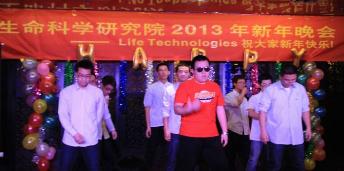 晚上6点,伴随着有力的节奏声,开场舞《江南style》点燃了全场的激情。简单的衣着,动感的舞步,充满激情的表演,9位男生的精彩舞蹈让欢呼声响彻全场。 美妙的舞蹈过后,四位主持人高举酒杯与全院在座的100多位师生共饮,表达最衷心的祝愿与美好的祝福。与此同时,生命科学研究院2013年新年晚会正式揭开神秘的面纱。