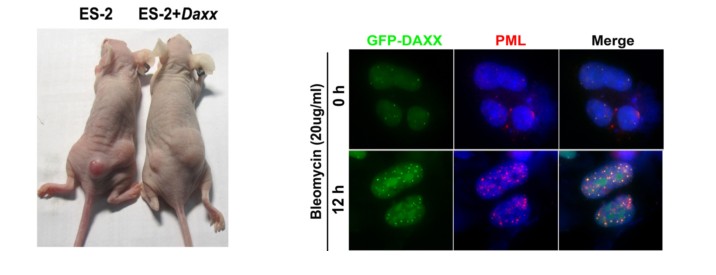 通过一系列分子机理方面的研究,他们进一步发现,DAXX与PML蛋白形成复合体,聚集在细胞核之中,形成一个叫做PML body的亚细胞结构。放化疗刺激可以增强癌细胞中DAXX的表达以及PML body数目的增加,从而增强了卵巢癌细胞对DNA损伤的抵抗能力,有助于癌细胞的存活。