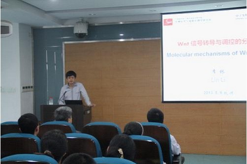冯新华院长向大家简要介绍了李林教授的研究背景和方向后,李教授给大家带来了题目为“Wnt信号转导与调控的分子机制”的报告。他首先介绍了经典Wnt信号转导网络的背景及研究现状,接着重点介绍了实验室十来年来对Wnt信号转导通路的分子机制、相关生物学功能及Wnt信号转导通路靶点及小分子化合物的研究。报告深入浅出,一步步解开了Wnt信号通路的面纱。