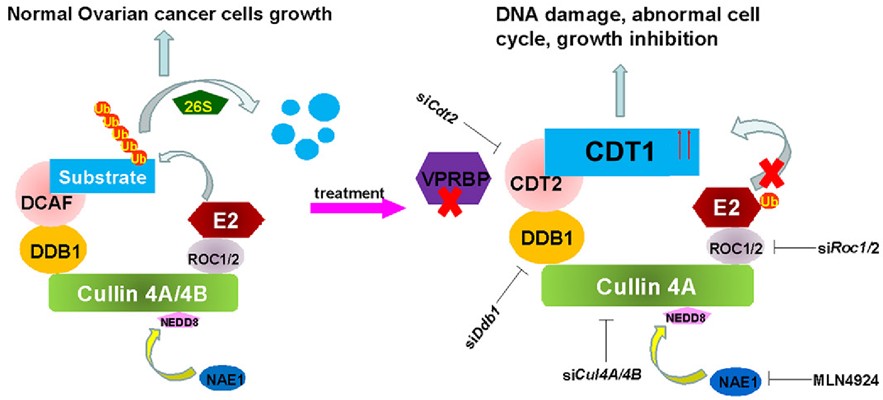 在本研究中,范衡宇课题组发现新型化疗药物MLN4924对卵巢癌细胞增殖具有明显抑制作用,并且能加强其他化疗药物的效果。MLN4924通过抑制Cullin家族泛素E3连接酶的活性而发挥作用。进一步的实验证明,该泛素连接酶家族的一个重要成员CRL4CDT2/DCAF2是MLN4924在卵巢癌细胞中的一个重要靶分子。