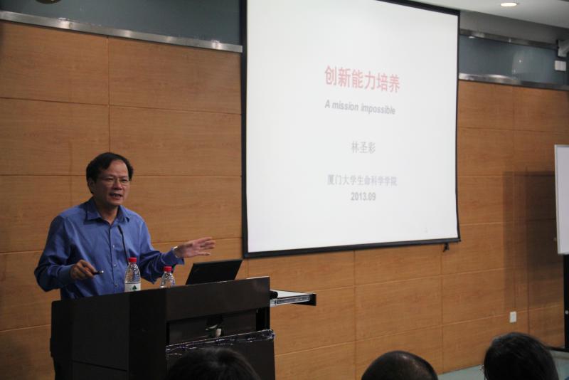晚上的205报告厅座无虚席。课程中,林圣彩教授从自己的生活经历与科研经历出发,旁征博引,从“什么是创新”,“成为科学家的基本要素”,“人文知识与科学思维”等多个方面对如何提高创新能力作出分析,并引导同学们进行思考:为什么要广读书,读书是不是为了“有用”?林教授还举了实验研究中的许多真实例子来阐释“灵感与基础知识”对成为一个具有创新精神的Biologist的积极作用。林教授讲课风格诙谐幽默,课堂上不时传来欢乐的笑声。