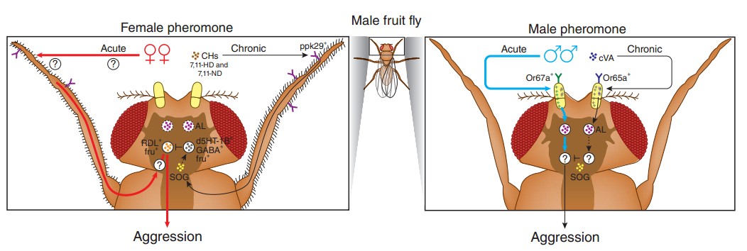 文章重点介绍了果蝇争斗性行为领域研究的一项最新进展(相关研究论文亦刊发于同期《自然-神经科学》杂志,作者是Quan Yuan et al),即雌雄果蝇之间的长期物理接触能够抑制雄性果蝇的争斗性行为。这一抑制现象很可能是由某种雌性非挥发性激素所介导,并通过激活一群雄性特有的、抑制性的γ-氨基丁酸能神经元而产生。这一发现为进一步理解动物争斗性行为的神经环路,以及内外因素如何调节争斗性行为提供了新信息。