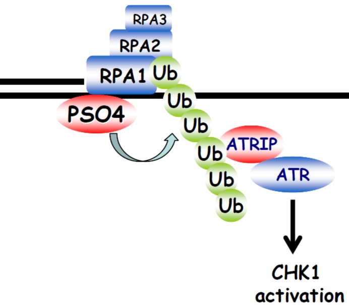浙大生命科学研究院黄俊课题组最近发现PSO4 complex能够通过与DNA单链结合蛋白复合物RPA相互作用从而被招募到DNA损伤位点。PSO4 complex进而促进RPA的多泛素化从而招募ATRIP/ATR并激活下游的重要激酶CHK1。黄俊博士是本文通讯作者,博士研究生万力是本文第一作者。论文题目是:“The PSO4 Complex Associates with RPA and Modulates the Activation of ATR”。