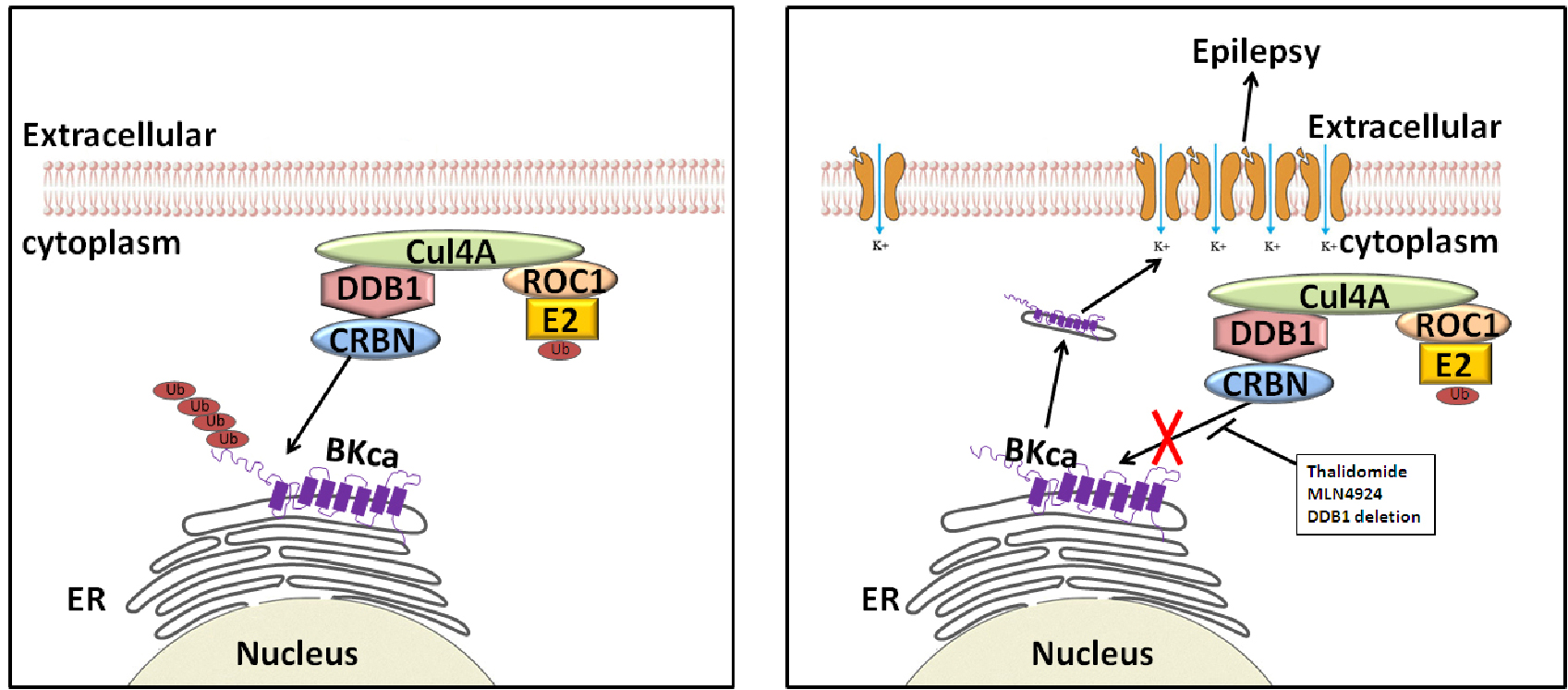 最近必一(中国)一站式服务平台仓勇课题组发现CRL4ACRBN E3 泛素连接酶可靶向BK离子通道使其多泛素化并滞留在内质网中,从而减少BK通道在细胞膜表面的分布。而CRL4ACRBN的失活可以使去泛素化的BK通道脱离内质网到达细胞膜,从而能显著提高通道的活性。在小鼠大脑中引入CRL4ACRBN突变可以在年老的小鼠中诱发自发性癫痫。而且这些突变小鼠或者用CRL4ACRBN的抑制剂去处理的小鼠对药物诱发的癫痫非常敏感。同时用BK通道的拮抗剂能显著缓解这一症状。