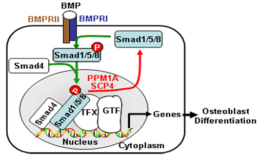 冯新华课题组在发现磷酸酶PPM1A可以终止整个TGF-β超家族的信号通路后,最近通过对磷酸酶库的深度筛选,发现并鉴定了CTDSPL2(SCP4)能够特异性地识别和去磷酸化骨形态发生蛋白(BMP)信号通路中的Smad1/5/8,不识别Smad2/3。该课题深入地揭示了CTDSPL2作为Smad1/5/8特异性磷酸酶在BMP的信号转导和干细胞功能中具有重要作用,为中胚层相关疾病的治疗提供了重要的理论依据。