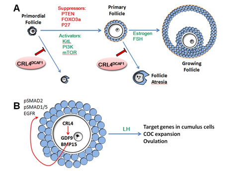 继2013年范衡宇课题组在Science杂志发表研究论文、首次阐明了CRL4在防止卵巢早衰和延缓更年期中的作用以后,在本研究中进一步利用基因敲除小鼠为模型,研究了该蛋白复合体在卵泡发育和排卵中的作用,发现CRL4对于维持卵母细胞生长和促进其对颗粒细胞的旁分泌功能,都具有重要生理意义。但是,CRL4对卵母细胞的调节作用独立于已知的PI3K信号通路。