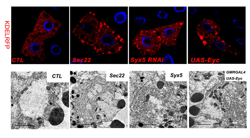 内质网是一个高度动态的细胞器,其在很多细胞生物学过程中起着十分重要的作用。内质网形态的异常和很多人类疾病相关联。但对于内质网形态的调节机制至今仍知之甚少。本研究利用模式动物果蝇通过正向遗传学的方法筛选到一个影响内质网形态的突变体Sec22 。已知Sec22在酵母、植物和人的同源蛋白参与内质网到高尔基的转运过程, 但关于Sec22 在动物发育过程中的生理作用却并没有被研究过。课题组发现Sec22 以及其结合蛋白Syx5, Eyc功能的失常均能导致内质网的扩张以及果蝇眼睛发育的缺陷。这项工作表明Sec22通过影响内质网到高尔基体的转运调节内质网的形态而其并不像在其酵母中的同源蛋白影响细胞自噬过程。该研究提示内质网到高尔基体的转运过程可能影响着内质网的形态,加深了我们对内质网形态异常疾病机制的理解。