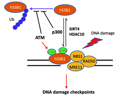 在本项研究中,黄俊教授课题组与康铁邦教授课题组合作发现hSSB1 第94位赖氨酸的乙酰化对于其发挥正常功能至关重要。研究发现,hSSB1 第94位的赖氨酸能被乙酰转移酶p300乙酰化以及被去乙酰酶SIRT4和HDAC10去乙酰化。当hSSB1的K94位处于被乙酰化状态时,hSSB1的多聚泛素化被抑制从而提高了蛋白稳定性,使其维持在一个较高的表达水平从而维持基因组稳定。本研究论文中黄俊教授与中山大学肿瘤医院康铁邦教授为共同通讯作者,我院博士研究生陈红霞与中山大学肿瘤医院博士研究生武远众为共同第一作者。