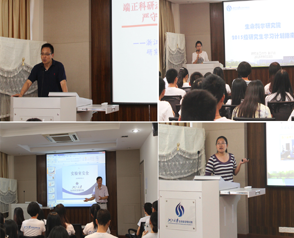 首先,冯新华院长向全体研究生新生进入生研院继续求学深造致以热烈的欢迎和诚挚的祝福。冯院长分别从科研、成长、心态、社交、身体、生活六个方面剖析如何“做一名合格的青年科研工作者”。冯院长说,科研上,知识与技能是理论和实践的平衡;独立与合作是导师指点方向,而个人能独立开展工作的过程;传统与创新更是站在巨人的肩膀上,推陈出新;计划是能合理约束、规划自身,当结果不符假设或预期时,学会改变思路和实验方法则是我们的应变之道。对于成长,冯院长鼓励大家除了要争取每一次让自己能力增强的机会,具备勇于面对困难,不放弃不抛弃的精神。他还希望大家能更加理解、孝顺自己的父母。冯院长更鼓励大家实验之余多与他人交流,关心善待周边的人,学会倾听更学会尊重。冯院长语重心长的谆谆教诲,幽默的演讲方式给了同学们颇多的启发,会场不时爆发出雷鸣般的掌声。最后,冯院长将Stewart Brand的“stay hungry, stay foolish”这句话,送给在场每一位研究生新生,勉励大家立志做一名合格的青年科研工作者。