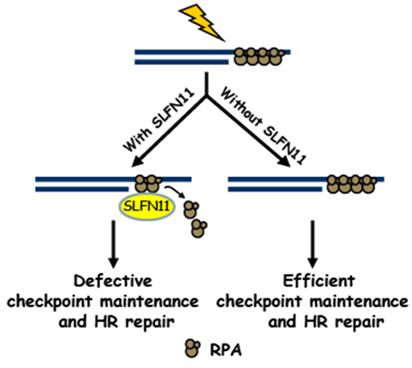 DNA损伤修复在维持基因组稳定以及抑制肿瘤发生的过程中起着至关重要的作用。DNA损伤修复缺陷既能够促进肿瘤的发生,也能够使得肿瘤细胞对化疗药物更加敏感。SLFN11的表达水平与肿瘤细胞对基于诱导DNA损伤的化疗药物的敏感度呈正相关性,但是其中的分子机制还完全不清楚。