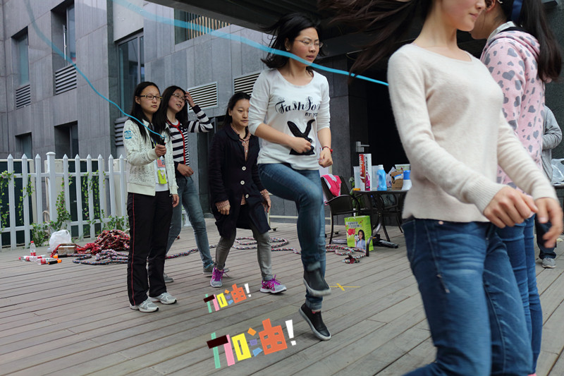 随着裁判员一声哨响,比赛正式开始。最能体现合作的项目莫过于“滴水不漏”,照片中同学那眉头微蹙,我想当下她恨不得合作伙伴有一双火眼金睛,可以穿透眼罩。最考验体力的是“跳大绳”,显然平时疏于运动的同学们在这个环节有些疲态,但是酣畅淋漓过后,回味起来兴致犹在。