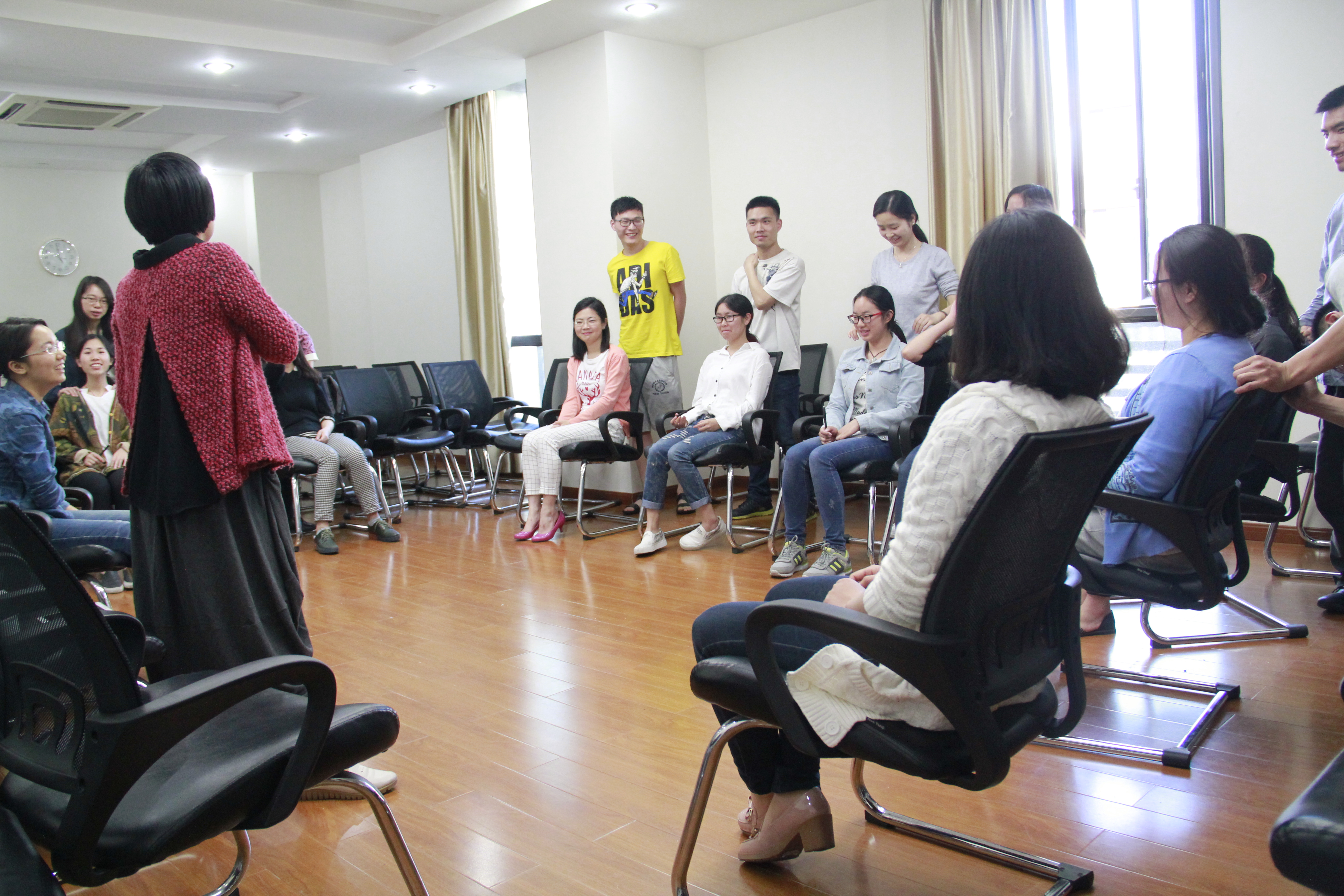 随后,刘艳老师将大家随机两两组合,通过“走向对方”、“一人一手控笔”、“为对方按摩”等两人互动游戏,让大家亲自体验人际交往中的微妙。游戏中,大家积极表达自己内心的情感变化,刘老师适时对大家的反馈做了相应的解释。通过游戏,大家学习到很多,比如,可以通过肢体语言来感知自己和别人的情绪变化;即使是亲密关系中的两个人,也需要通过细节来感知对方从而给对方提供合适的的个人空间;人与人相处是需要不断感知,不断调整,不断适应和磨合的等等。