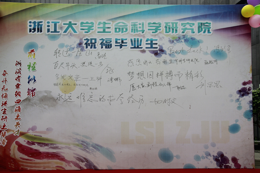 一早,穿着学位服的毕业生们陆续来到活动场地,踏上红毯。这里,已然充满了喜悦和欢笑。家长的陪伴、导师的出席、实验室师弟师妹们的助阵,都为毕业生们在即将告别浙大生研院时留下了最珍贵的剪影。冯新华院长代表研究院向毕业生们送上祝福,祝福大家在未来的发展道路上一切顺利,并和到场的毕业生合影留念。毕业生们穿着学位服,戴着学位帽,在毕业生喷绘前留下他们的单人照。之后,或与导师,留下涌动师生情谊的“最温情”合照,或与父母,留下展现父子心情的“最欣慰”合照,或与学弟学妹,留下饱含祝福的“最真挚”合照。拍完合影,毕业生们在喷绘上留下他们的签名和对生研院的祝福。