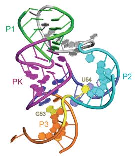 | Pistol核酶三维空间结构 | Pistol核酶催化中心构象 |
