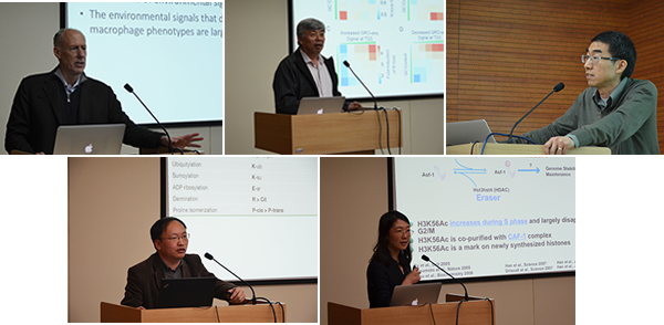 会议涉及蛋白质机器与转录调控的多个领域:Glass教授向大家展示了利用全基因组的方法检测人和小鼠中小胶质细胞的转录组和表观遗传修饰的区别。付向东教授从RNA world、中心法则讲起,介绍新生RNA在生物学调控中的重要功能,并讲述了3个精彩故事。管坤良教授阐述了Hippo信号通路在调节肿瘤免疫方面的重要作用。翁杰敏教授向我们讲述了一类新型组蛋白泛素化修饰,赖氨酸巴豆酰胺化的酶体系及其在转录调控中的潜在功能。李晴教授展示了他们在DNA复制偶联的核小体组装的机制方面做出重要突破。