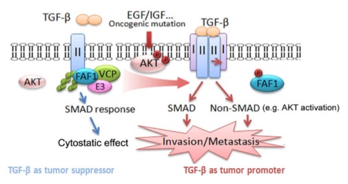 本文章从研究受体的结合蛋白入手,发现TβRII受到FAF1这个接头蛋白的严密控制。FAF1通过招募VCP和E3连接酶复合物限制了细胞膜上TβRII的水平。由于极低的TβRII就能保证持续不断地磷酸化TβRI从而发挥SMAD介导的正常功能,这种调节方式既保持了下游SMAD信号的正常传递,又防止了TβRII的过度激活。而在肿瘤发展后期,尤其是当肿瘤响应刺激或者接受诱导获得AKT的激活后,FAF1的特异性丝氨酸位点会被AKT磷酸化从而脱离细胞膜并丧失上述功能,导致膜上TβRII的水平上调,激活SMAD和非经典SMAD信号通路,促进肿瘤转移。另一方面,AKT又能阻断SMAD介导的细胞周期调控,因而TGF-β/SMAD能快速地被扭转成为促进肿瘤转移的驱动力。