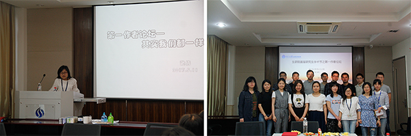 5月11日,第一作者论坛在457举行。主讲人是博士研究生张倩。她以“其实我们都一样”为题,以轻松诙谐的方式介绍了论文相关情况以及其一路成长历程。她用亲身经历告诉大家,其实大家都一样,要学会克服科研道路上的困难,学会与他人合作和配合完成课题。之后,张倩一一回答了同学们的各种问题,现场气氛热烈。
