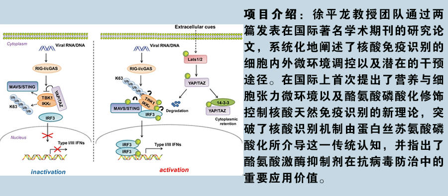 徐平龙团队的这两项重要研究成果分别于2017年4月和6月以研究长文形式发表于《Nat Cell Biol》和《Cell Host Microbe》。资深免疫专家、爱尔兰免疫学会主席Lavelle教授在同期《Nat Cell Biol》上发表专文高度评价此工作;Science子刊Sci Signal资深编辑Wong博士将此工作作为“编辑专选”进行正面评价;研究工作也被《中国科学报》头版、新华社、凤凰网等数十个媒体亮点报道。上述一系列的创新成果是核酸免疫识别基础研究上获得的关键理论突破,对病毒感染、自身免疫疾病和抗肿瘤免疫的基础与临床研究及新药研制具有重要指导意义。