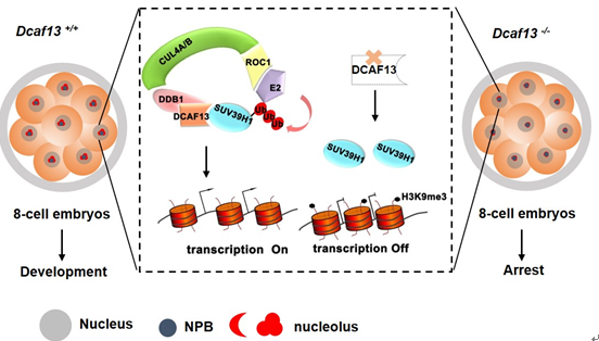 在本研究中,课题组发现DCAF13与SUV39H1蛋白分子可以相互结合,并在细胞核中共定位。进一步在受精卵中过表达SUV39H1,胚胎能产生类似DCAF13敲除的现象;生化实验证实,DCAF13把SUV39H1招募到CRL4 E3泛素连接酶复合体上,使SUV39H1发生多聚泛素化并被降解,维持8-细胞胚胎阶段的H3K9me3处于低水平,从而促进核糖体DNA和一些早期胚胎胚层分化相关基因的活跃转录。该研究不仅发现了维持早期胚胎发育潜能的新分子,也揭示了早期胚胎高效重编程的内在分子机制。