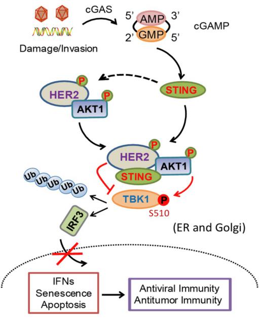 徐平龙实验室通过小分子文库和cDNA文库筛选发现,HER/EGFR家族的受体酪氨酸激酶HER2/ErbB-2,但不是EGFR或者其他家族成员,能够强烈抑制cGAS-STING通路介导的DNA免疫识别,并因此阻止肿瘤细胞的干扰素生成、细胞衰老和凋亡。机制上,HER2通过胞内结构域(ICD)强烈亲和STING的胞内羧基端结构域(CTD)在内质网上组成复合体,并特异性招募AKT家族AKT1蛋白激酶到STING信号复合体,直接磷酸化修饰TBK1的511位点丝氨酸, 从而阻抑STING-TBK1互作及TBK1 K63型泛素化,有效抑制STING通路。值得注意的是,DNA免疫识别的激活也伴随着AKT通路的显著激活,从而构成AKT1介导的重要负反馈抑制。因此,针对HER2-AKT1-TBK1信号轴的遗传敲除、遗传敲入或者药学抑制干预能够明显增强DNA免疫识别信号,促进损伤诱导的细胞衰老与凋亡,以及DNA免疫识别介导的动物水平的抗病毒宿主防御和肿瘤免疫。该工作不仅首次提出并阐述了经典致癌基因和致癌通路的天然免疫调控功能和分子机制,也揭示了HER2-AKT信号轴在抑制肿瘤免疫和控制细胞损伤应答中的关键作用。