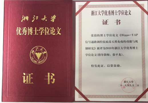 9月7日,在浙江大学2019级研究生新生开学典礼上,校党委副书记郑强宣读《2018年优秀博士学位论文获得者表彰决定》,校党委书记、校长及校领导等为十位优秀博士学位论文获得者颁发了获奖证书。其中我院博士毕业生张倩的学位论文《Hippo-YAP信号通路调控抗病毒天然免疫的功能与机制研究》获评2018年浙江大学优秀博士学位论文。同时,我院博士毕业生张正奎的学位论文《SUMO化修饰的OTUB2去泛素化稳定YAP/TAZ促进乳腺癌的转移》被评为优秀博士学位论文提名论文。