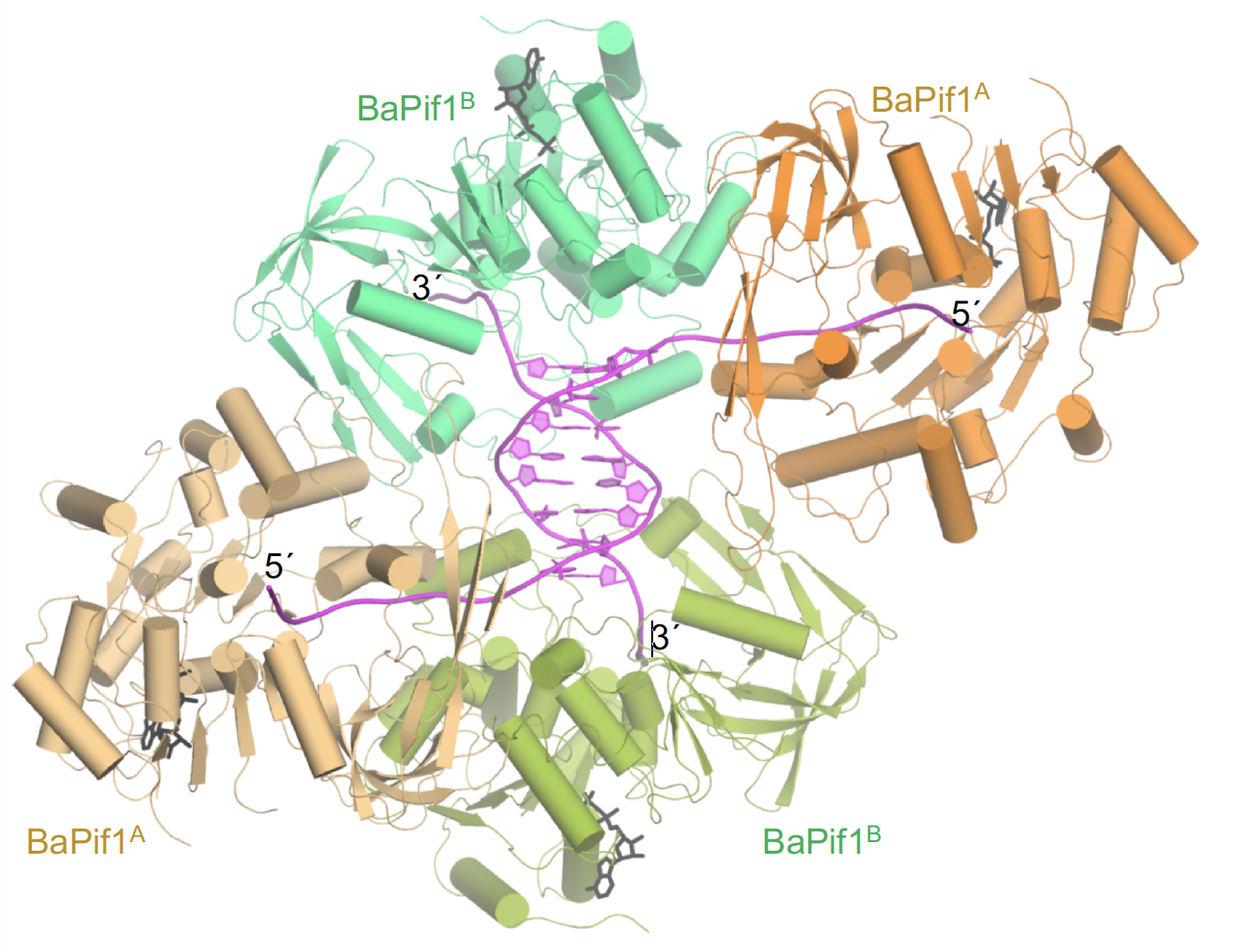 Pif1是解旋酶SF1B超家族成员,从原核到真核高度保守,能够利用ATP水解提供的能量,按照5’-3’方向对dsDNA、DNA/RNA杂合体、G4 DNA进行解旋,是生物体内非常重要的一类解旋酶。Pif1在维持基因组稳定性方面起着多种作用,并且优先解旋分叉的dsDNA(forked dsDNA),但Pif1解旋forked dsDNA的分子机制尚不清楚。宋海卫实验室以拟杆菌BaPif1为研究对象,用结构生物学方法解析了BaPif1与forked dsDNA复合物的晶体结构。两个相互作用的BaPif1分子分别与部分未解开的dsDNA的单链部分结合,并分别与5′arm和3′ss/dsDNA相互作用。该结构揭示了几个重要特征,这些特征将BaPif1与任何其他已知的SF1和SF2解旋酶区分开来。首先,结合到5'arm的BaPif1分子打开第一对配对的碱基对,从而启动BaPif1对forked dsDNA的解旋,而结合到3'arm的BaPif1分子则通过稳定第一个断裂的碱基对,在解旋过程中起辅助作用,使第二个碱基对处于断裂前状态;其次,结合在3′arm上的BaPif1分子阻止了移位链与追踪链的重新配对形成双链;随后,两个BaPif1分子通过静电作用相互接触,这种相互作用可能使两个BaPif1分子互相调节其解旋酶活性。该文章使用动力学方法(Kinetics)和单分子荧光共振能量转移(single-molecule FRET)方法,研究表明分叉处结合的两个BaPif1分子都具有解旋酶活性,并且彼此之间的相互作用可以调节其解旋酶活性。通过结构以及动力学和smFRET数据进行分析,使我们了解了BaPif1解旋分叉dsDNA的分子机制。这些结果不仅解释了先前的生化实验,而且为进一步阐明Pif1解旋酶解旋DNA/RNA杂合体和G4 DNA的机制提供了框架。