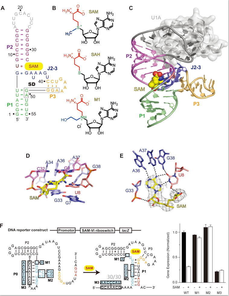 S-腺苷甲硫氨酸(S-adenosylmethionine, SAM),是生物体内的一类重要的小分子代谢物,在不同生物种属均发挥至关重要的作用。SAM核开关特异性识别SAM,是目前种类最多的一类核开关,分为SAM-I、SAM-IV、SAM-I/IV、SAM-II、SAM-V、SAM-III、SAM-VI等多个亚型。 SAM-VI核开关是2017年被鉴定出的一类新型核开关,可以特异性地识别SAM,而对与SAM结构类似仅少一个甲基的代谢产物SAH响应很弱。二级结构显示,SAM-VI核开关含有三个茎区(Stem)P1、P2和P3,它们连接在同一个大内环上,形成一个三通路(3-way junctional)的RNA结构。 茎区P3长度相对较短,与茎区P1直接相连,核糖体结合位点SD序列就处于茎区P1和P3的连接区域(图A)。