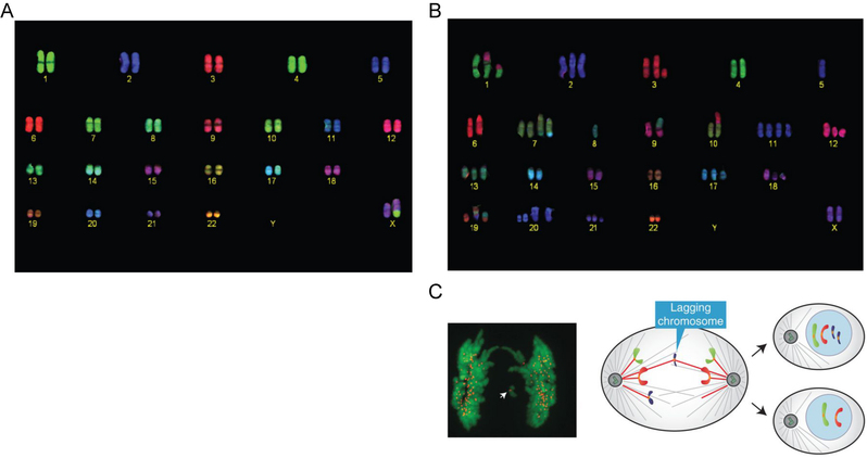 图1:(A和B)正常人体细胞中的46条染色体和人结肠癌细胞中的59条染色体(Janssen A et al., Science, 2011);(C)有丝分裂期染色体错误分离产生非整倍体细胞的示意图(Varetti G et al., Cold Spring Harb Perspect Biol, 2014)。