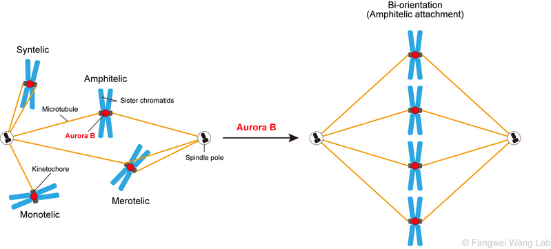图2:蛋白激酶Aurora B在纠正动粒与微管的错误连接中发挥重要作用。