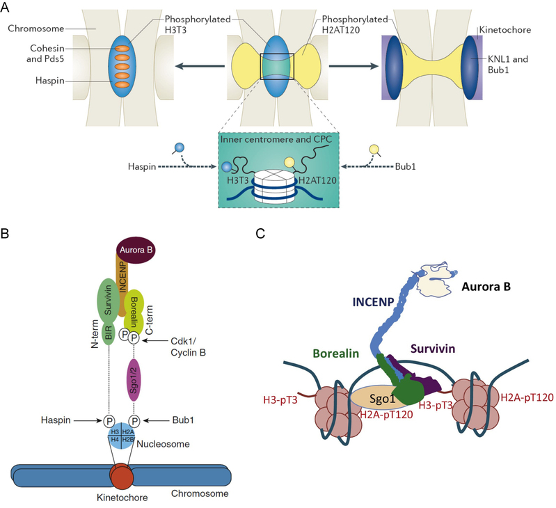 目前已知,染色体乘客复合体(Chromosomal Passenger Complex,简称CPC)的激酶亚基Aurora B在纠正动粒与微管错误连接的过程中发挥关键作用。在染色体分离前,依赖于组蛋白H3第3位苏氨酸的磷酸化(H3pT3)和H2A第120位苏氨酸的磷酸化(H2ApT120),Aurora B高度富集于内层着丝粒区(Kelly A et al., Wang F et al., Yamagishi Y et al., Science, 2010)。目前,有三种假设模型被用来解释H3pT3和H2ApT120如何使Aurora B定位至着丝粒区:一种模型认为(图3A),H3pT3和H2ApT120在着丝粒区分布的交叉区域招募了CPC(Carmena M et al., Nat Rev Mol Cell Biol, 2012),另外两种模型认为(图3B和C),CPC通过其Survivin和Borealin亚基分别直接或间接地结合位于同一核小体或相邻核小体上的H3pT3和H2ApT120(Vader G and Lens S, Current Biology, 2010; Trivedi P and Stukenberg PT, Trends Biochem Sci, 2015)。这些假设模型要么分子机制不明,要么实验证据不全。此外,Aurora B在着丝粒区的定位对于染色体正确分离的重要性尚不清楚(Tanaka T et al., Cell, 2002; Liu D et al, Science, 2009; Campbell C and Desai A, Nature, 2013)。