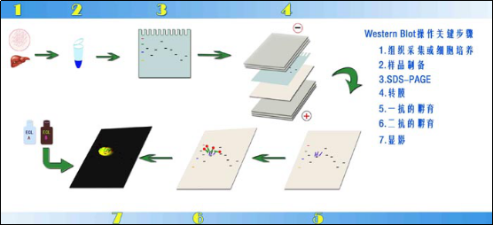 Western Blot采用的是聚丙烯酰胺凝胶电泳,被检测物是蛋白质,“探针”是抗体,“显色”用标记的二抗。经过PAGE分离的蛋白质样品,转移到固相载体(例如硝酸纤维素薄膜)上,固相载体以非共价键形式吸附蛋白质,且能保持电泳分离的多肽类型及其生物学活性不变。以固相载体上的蛋白质或多肽作为抗原,与对应的抗体起免疫反应,再与酶或同位素标记的第二抗体起反应,经过底物显色或放射自显影以检测电泳分离的特异性目的基因表达的蛋白成分。