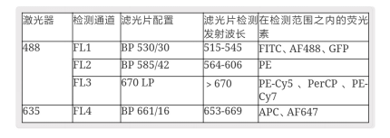 比如BD Calibur是双激光四色,配置的激光器和能够检测的通道如下。