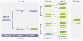 将这些步骤重复(“循环”)25-35次,即可按指数方式获得精确的目标DNA拷贝(如图所示)