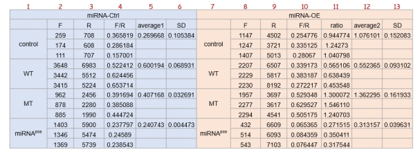 3.再以miRNA-Ctrl组的average1为标准1,用miRNA-OE组的F/R三个重复值(第10列)分别除以average1 得到三个ratio(相当于进行了一个标准化);