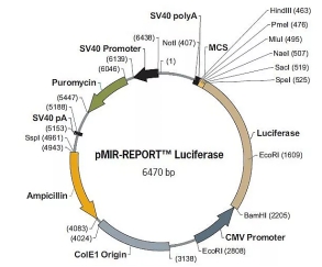 (1)pMIR-REPORT载体:它用来插入miRNA靶序列,评估细胞内miRNA功能。该载体包含一个CMV启动子控制下的萤火虫荧光素酶报告基因。在荧光素酶基因的3'UTR区域包含一个多克隆位点,用于插入预测miRNA的结合靶序列或其他核苷酸序列。若荧光素酶活性下降,说明该段插入序列受到miRNA调节,这模仿了miRNA靶序列的作用方式。