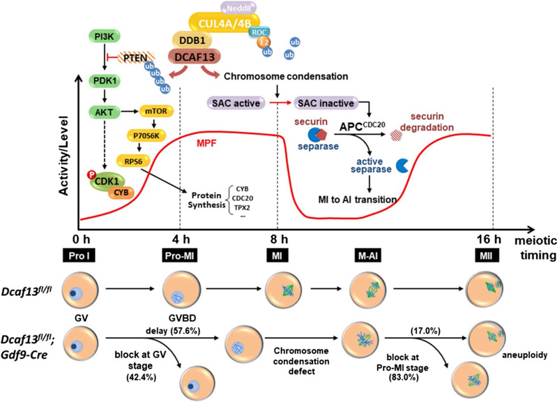 范衡宇教授实验室在之前的研究中发现了一个新的CRL4 E3泛素连接酶底物识别蛋白DCAF13,在人和小鼠早期胚胎中高表达,并发现缺失DCAF13的胚胎只能发育至桑葚胚阶段(Zhang, et al, EMBO Journal, 2018)。为了进一步阐明DCAF13在卵泡发育和卵母细胞中的功能,范衡宇教授实验室在卵母细胞中特异性敲除Dcaf13基因,发现Dcaf13敲除影响了pre-rRNA的剪切和核糖体小亚基的组装,导致这些卵母细胞生长缓慢,很快凋亡,造成卵巢早衰(Zhang, et al, Cell Death & Differentiation, 2018)。在接下来的研究工作中,该课题组对Dcaf13在减数分裂成熟过程进行了细致的观察和机制探索。结果发现,CRL4BDCAF13 E3泛素连接酶可以识别并泛素化降解PI3K信号通路的抑制因子PTEN,从而维持了卵母细胞中AKT的活性,促进细胞周期激酶CDK1的激活,推动减数分裂恢复。当卵母细胞中DCAF13缺失后,PTEN蛋白被积累,PI3K信号通路不能正常激活,使得部分卵母细胞不能恢复减数分裂,阻滞在第一次分裂前中期;同时卵母细胞中DCAF13缺失后也导致后期促进复合体APC不能正常激活,阻碍了卵母细胞从中期向后期转换。