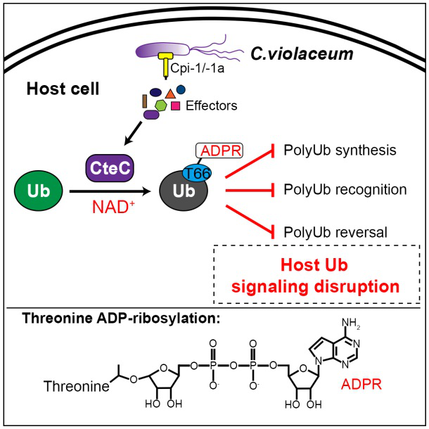 图1. 紫色色杆菌三型效应蛋白CteC对宿主泛素分子进行苏氨酸ADP-核糖基化修饰的分子机制示意图。