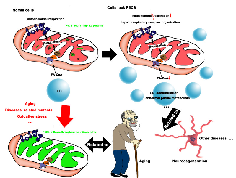 本研究揭示了P5CS可以作为一个外界刺激的感受器调控整合多种线粒体代谢途径,为研究线粒体调控神经系统稳态维持和衰老提供了新的思路。也从一个新的角度揭示了ALDH18A1突变的致病机制。