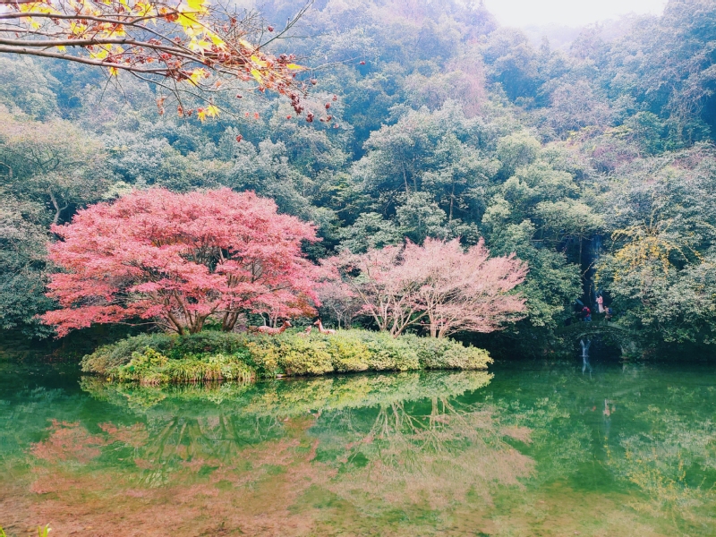 竹林溪水弄潋滟,远山枫叶醉红裳。穿过龙井山庄,师生一起来到了九溪十八涧。潺潺的溪水淌过色彩斑斓的河床,高耸的竹林直冲云霄,河对岸的小瀑布旁红色的枫叶和黄色的银杏为毅行之路增添了生动的色彩。