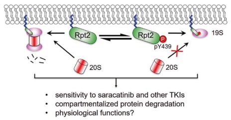 本研究发现了新的蛋白酶体激酶和磷酸酶,首次揭示了酪氨酸磷酸化参与调控膜定位蛋白酶体的机制,为临床上酪氨酸激酶抑制剂的有效使用和疗效预测提供了新的见解。