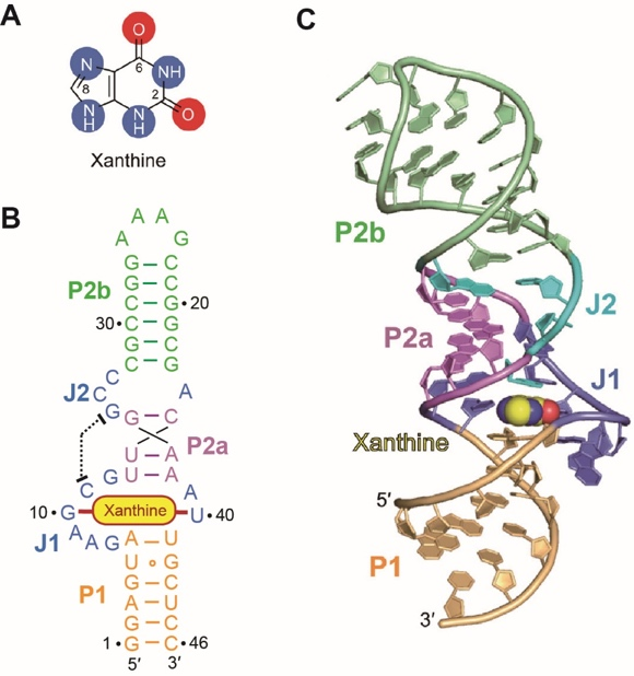嘌呤及其衍生物是细胞内最为丰富的一类代谢物,广泛地存在于生命体中并发挥重要的生理作用,也因此嘌呤的代谢在细胞内受到严格的调控,代谢失调会导致严重的细胞紊乱。黄嘌呤(图A)是嘌呤降解代谢过程中的氧化产物,可在黄嘌呤氧化酶的作用下进一步氧化产生尿酸,广泛存在于人体及其他生物体内。2020年,耶鲁大学的Ronald Breaker课题组在变形杆菌中鉴定出一类新型RNA 结构模块(motif)NMT1,随后发现NMT1能够以微摩尔级别亲和力与黄嘌呤结合,因此将其称为黄嘌呤核开关。二级结构研究表明黄嘌呤核开关主要含有两个茎区P1和P2,它们由一个大的Junction(J1)连接;其中茎区P2又被中间含有的一个小Junction(J2)分为P2a,P2b两个小茎区。进一步分析显示,黄嘌呤核开关中位于连接处的核苷酸序列高度保守(图B)。