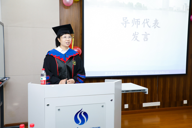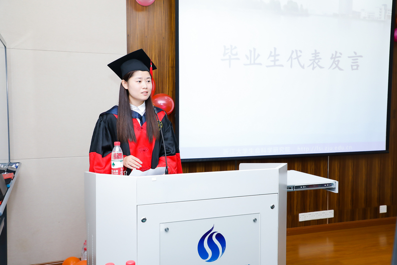 祝赛勇老师实验室的毕业生代表王卫云发表毕业感言,她回顾了自己五年的博士生涯,对这趟旅程中予以自己帮助的平台、老师和同学表达了感谢。她号召所有毕业生不忘母校之恩,不负时代使命,向优秀的校友看齐,争创美好未来。