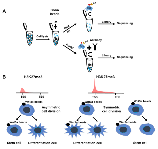1. 通过SET-seq证实了在Wnt3a诱导的小鼠胚胎干细胞不对称分裂过程中H3K27me3作为关键调控因素起到了重要作用A. SET-seq建库原理。ConA beadsConcanavalin A beadsB. H3K27me3Wnt3a诱导的细胞不对称分裂起到重要作用。TSS,转录起始位点;TES,转录结束位点。