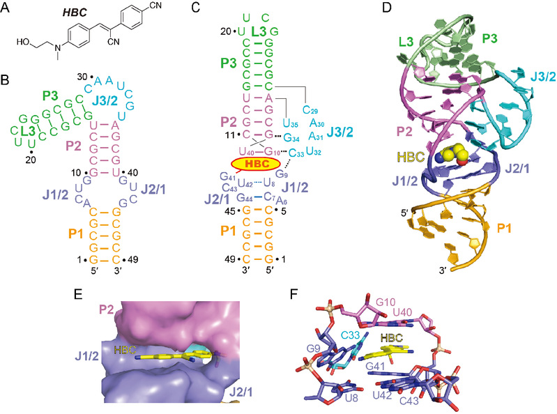HBC((4-((2-羟乙基)(甲基)氨基)-亚苄基)-氰基苯乙腈)是基于绿色荧光蛋白GFP的荧光团HBI(4-羟基亚苄基咪唑啉酮)开发的一种新型染料配体(图1A)。通用SELEX(指数富集的配体系统进化)技术体外筛选得到的Pepper适配体可以特异地结合HBC并激活其荧光,其二级结构如图1B所示。为了阐明Pepper适配体识别配体HBC的机制,任艾明课题组采用X-射线晶体学的方法解析了Pepper-HBC复合物的晶体结构,与绝大多数已有的RNA荧光适配体不同,其三级结构中不包含G-四联体。