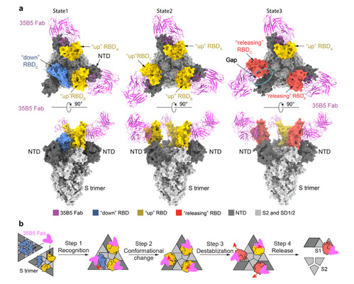为了研究35B5抗体的广谱、强效中和作用的结构基础,研究者采用冷冻电镜技术尝试解析了35B5的Fab区与新冠病毒Spike蛋白的复合物结构。研究者发现,35B5 Fab在体外导致Spike蛋白S-2P稳定突变体的快速解聚,即使更加稳定的S-6P突变体也很容易被35B5 Fab解聚。通过快速冷冻的方法,研究者成功获得了35B5 Fab与S-6P突变体蛋白的复合物冷冻电镜样品,并解析了该复合物三个状态的结构。状态1复合物中Spike的3个RBD结构域中的2个处于典型up构象,并各结合一个Fab,而另一个RBD处于down构象;状态2复合物中的3个RBD均处于典型up构象,并各结合一个Fab;状态3复合物中的3个RBD也均有Fab结合,但只有1个处于up构象,其他2个处于往外摆出的释放(releasing)构象,暗示该Spike分子正在发生解聚(图2a)。进一步的结构分析提示,35B5 Fab可以通过识别down状态下 RBD的少数暴露的抗原表位氨基酸残基,通过与临近NTD结构域之间产生互斥力,导致RBD由down构象转变为up构象,引起Spike蛋白不稳定,RBD进而外摆进入releasing构象,从而解聚Spike三聚体结构(图2b)。