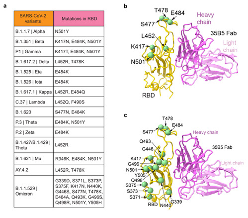 (图4、35B5单抗的结合表位与VOCs突变位点的关系)