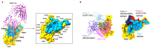 值得注意的是,35B5 Fab结合的RBD抗原表位面积高达1029平方埃,包含多达30个氨基酸残基(图3a)。这些氨基酸残基与35B5之间形成大量氢键和盐键,使得35B5对RBD的亲和能力可达pmol水平。此外,35B5识别的RBD抗原表位非常独特,与以往报道的四种RBD抗体的抗原表位都不一样,其位于I类抗体抗原表位(ACE2的结合区)的对面,说明35B5不直接阻断Spike对宿主受体的识别,虽与II类和III类抗体的抗原表位有部分重叠,但其大多数参与结合35B5的氨基酸残基均不在2类或3类抗体的抗原表位上(图3b)。