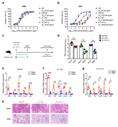 研究者前期研究表明,新冠康复病人的疾病程度与中和抗体水平呈正相关[2](https://mp.weixin.qq.com/s/AxCfcw7dujaYiCHeuhvdYg),因此可以推测,在新冠重症病人里,相对快速恢复者的体内可能具有更强的中和抗体。研究者从这一类康复病人里克隆到35B5单抗,并且该抗体可高效地中和一系列VOCs毒株,包括B.1.351(南非株;贝塔株)及B.1.617.2(印度株;德尔塔株)(图1)。